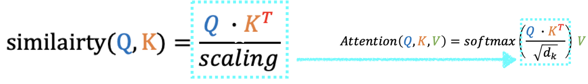 (** 여기서 scaling 상수는 Key의 Dimension에 루트를 씌운 값으로 대체해서 쓴다.)