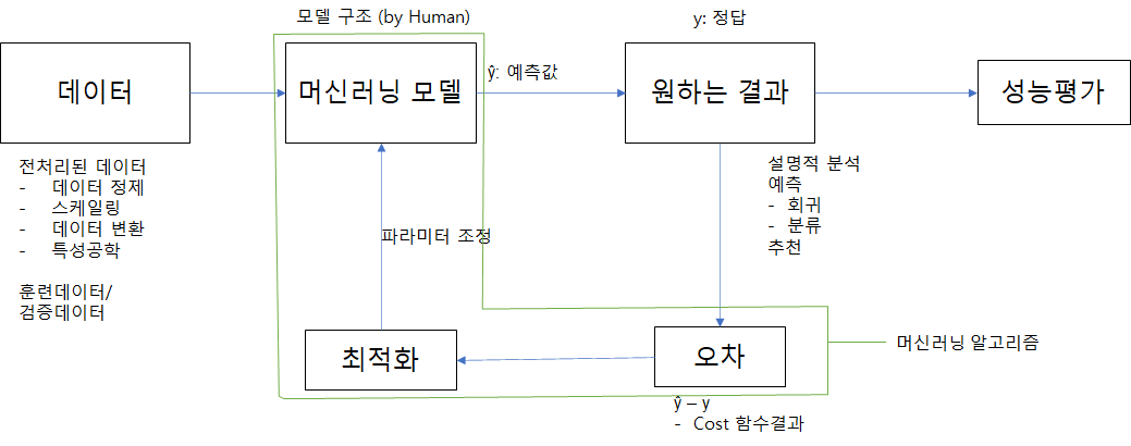 ◾ 손실함수(Cost function)를 통해 가설의 파라미터 조정을 통해 오차를 줄여나감(최적화) -> 모델 완성